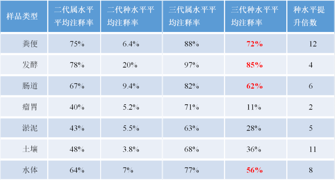 運(yùn)用三代測(cè)序,可以輕松跨越V1-V9區(qū),進(jìn)而獲得全長(zhǎng)序列,序列中攜帶的特征信息更多,可以支持“種”水平的分辨率,在文章撰寫中可在種水平進(jìn)行深入挖掘和討論,尤其是在biomarker的尋找。常規(guī)樣本平均種水平注釋率可達(dá)60%。