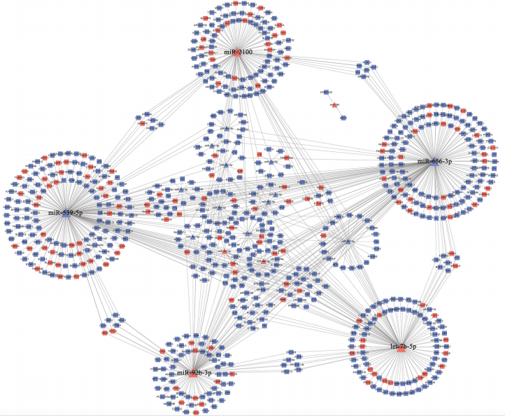 (圖5)關鍵miRNAs靶向mRNA的PPI網(wǎng)絡圖