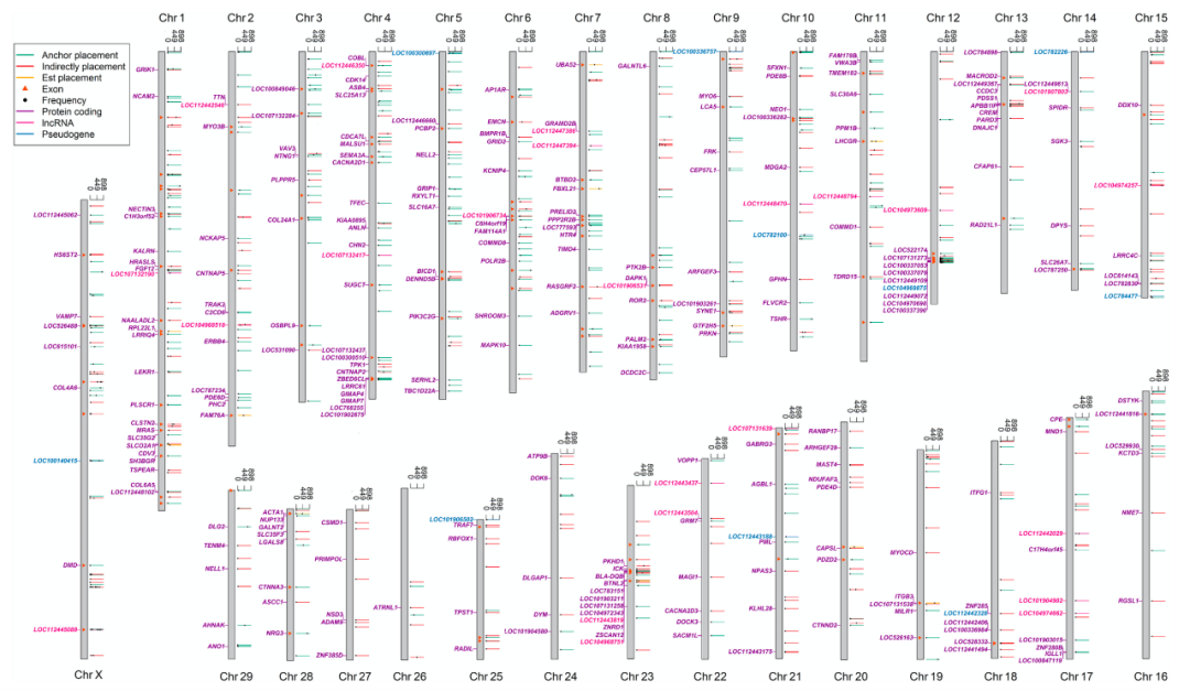 為解決以上問題,該文章通過開發(fā)新的基因組分析流程,對(duì)來自世界57個(gè)品種898頭牛的基因組序列進(jìn)行組裝和SV檢測(cè);發(fā)現(xiàn)了83Mb的?;蚪M未知序列,相當(dāng)于目前參考基因組序列總長(zhǎng)度的3.1%,并且從中鑒定出大量未知外顯子序列,最后綜合三種策略成功將1007條contig放置在現(xiàn)有參考基因組上,這些序列可能通過外顯子破壞、外顯子添加等方式影響了279個(gè)基因的序列結(jié)構(gòu)。
