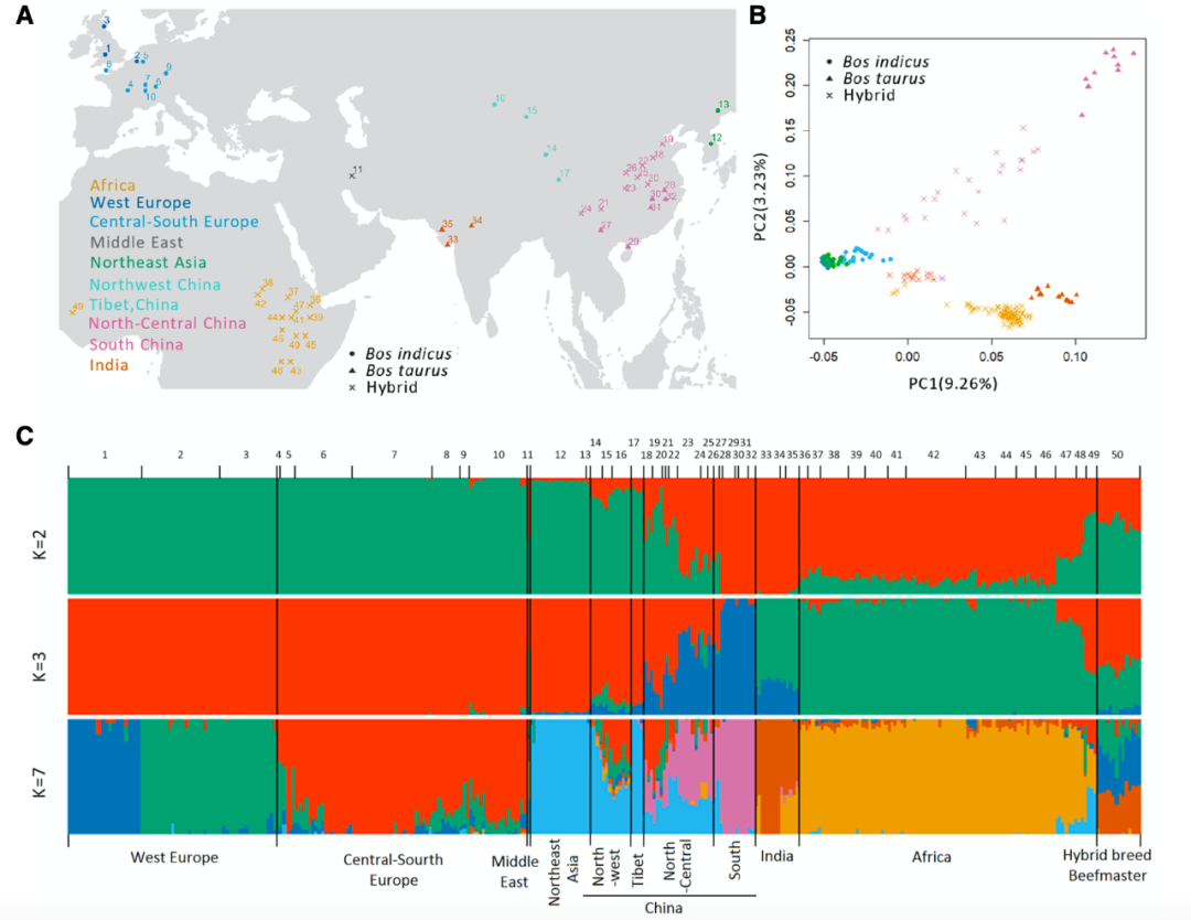 圖3利用SV(缺失型變異)對(duì)世界牛品種展開精準(zhǔn)群體學(xué)分析