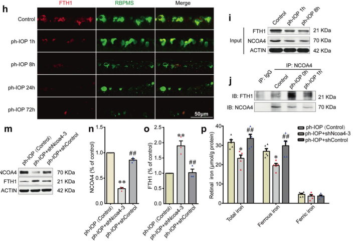 鐵蛋白(Ferritin)是一種廣泛存在的儲鐵蛋白,在 ph-IOP 損傷后1小時,F(xiàn)TH1(Ferritin亞基)的水平急劇下降(圖2h),這與 ph-IOP 損傷后早期的鐵積累一致;鐵自噬(ferritinophagy)是一種調(diào)節(jié)細胞內(nèi)鐵代謝的選擇性自噬,檢測視網(wǎng)膜內(nèi)源性NCOA4(鐵自噬關(guān)鍵調(diào)節(jié)蛋白)蛋白水平發(fā)現(xiàn),pH-IOP 損傷后NCOA4與 FTH1之間的內(nèi)源性相互作用增強(圖2i, j);敲降Ncoa4后增加了視網(wǎng)膜 FTH1水平(圖2m-o),并伴隨著 ph-IOP 損傷后視網(wǎng)膜中二價鐵離子水平的降低(圖2p)。