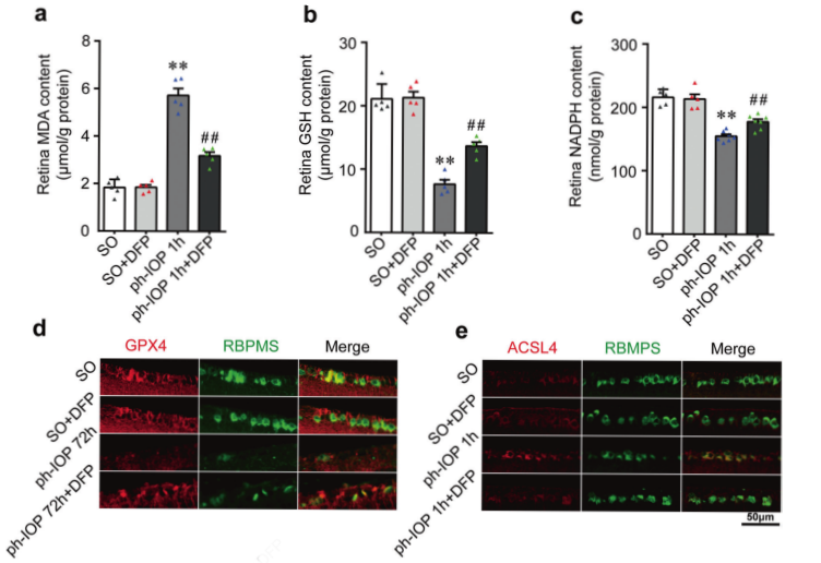 去鐵酮DPF作為鐵螯合劑目前已應(yīng)用于臨床治療鐵超負荷疾病,阻止患者血清鐵的蓄積。進一步研究DFP對ph-IOP損傷小鼠鐵代謝的影響。體內(nèi)體外結(jié)果顯示,DFP處理可以顯著降低 ph-IOP誘導的視網(wǎng)膜二價鐵累積;DFP治療可降低ph-IOP損傷后視網(wǎng)膜MDA含量(圖4a),增加GSH和NADPH水平(圖5b, c );此外,在ph-IOP損傷小鼠中,DFP處理恢復了GPX4水平,并降低了ACSL4水平(圖5d-e)。以上結(jié)果表明,DFP可以改善ph-IOP誘導的視網(wǎng)膜鐵死亡。