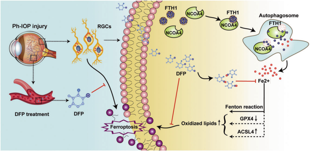 在生理狀態(tài)下,細胞內(nèi)鐵處于動態(tài)平衡狀態(tài),但在病理狀態(tài)下,這種平衡會被打破。Ph-IOP 損傷可以激活RGC細胞內(nèi)的NCOA4,激活的NCOA4將結(jié)合FTH1并觸發(fā)溶酶體降解FTH1(稱為鐵自噬)。降解的FTH1會釋放大量的游離鐵離子,這種具有氧化還原活性的金屬會進一步參與脂質(zhì)過氧化。最終,由鐵引起的脂質(zhì)過氧化氫的積累導致RGC鐵死亡,但口服DFP可以螯合細胞內(nèi)多余的游離鐵離子,抑制ph-IOP誘導的RGC鐵死亡。