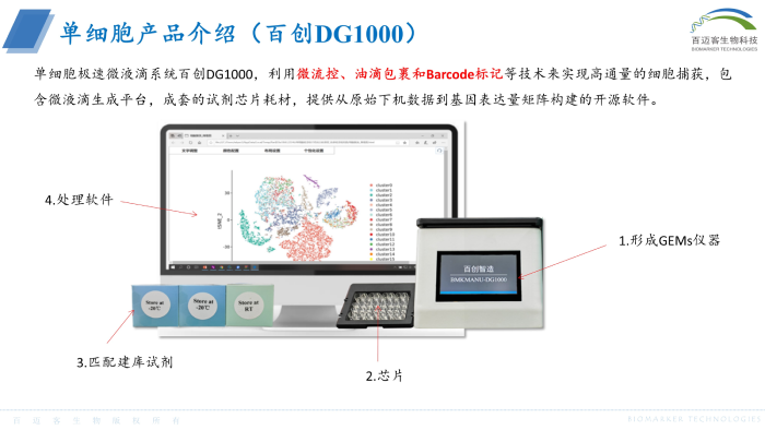單細胞極速微液滴系統(tǒng)百創(chuàng)DG1000,利用微流控、油滴包裹和Barcode標記等技術來實現(xiàn)高通量的細胞捕獲,包含微液滴生成平臺,成套的試劑芯片耗材,提供從原始下機數(shù)據(jù)到基因表達量矩陣構建的開源軟件。