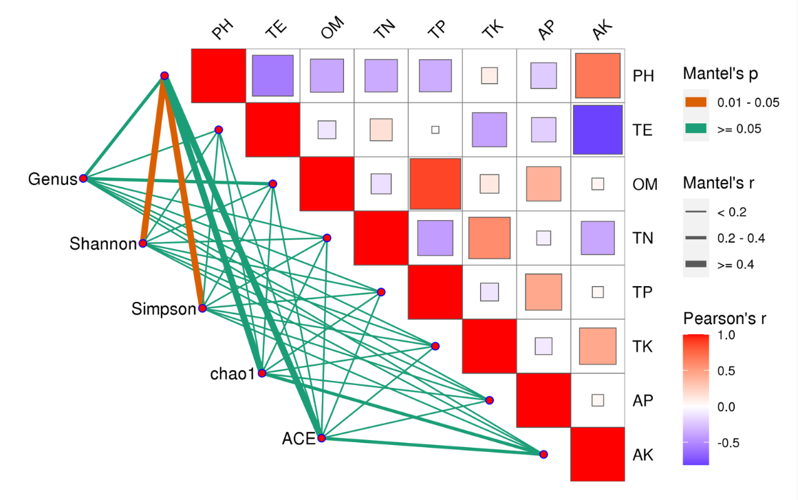 Mantel Test分析:Mantel test 是檢驗兩個矩陣相關關系的非參數(shù)統(tǒng)計方法,多用在生態(tài)學上,用來檢驗群落距離矩陣(如 Bray-Curtis distance matrix)和環(huán)境變量距離矩陣(即環(huán)境因子指標)之間的相關性。其可以得到特征與環(huán)境因子之間的mantel test的r值和p值。