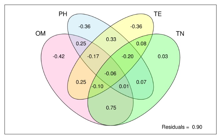 VPA分析(方差分解分析):VPA,全稱Variance Partitioning Analysis,中文稱為方差分解分析,該分析的目的是確定指定的環(huán)境因子對群落結構變化的解釋比例。通常在CCA/RDA的排序分析方法可以得到所有參與分析的環(huán)境因子對群落變化的解釋比例。使用R語言vegan包(version:2.3-0),varpart函數(shù)進行分析;分析前首先需要對環(huán)境因子進行一個分類,一般支持2-4類,默認使用大于等于2個環(huán)境因子進行此分析。