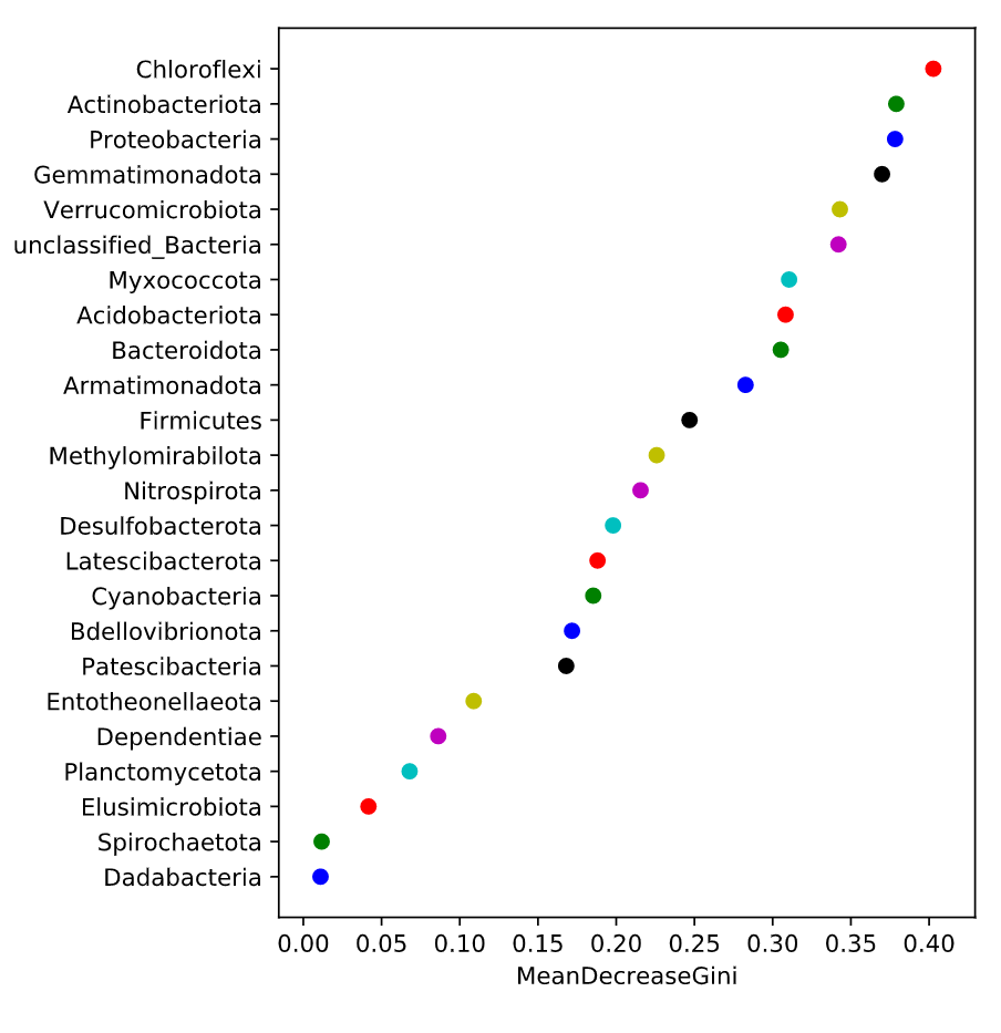 隨機森林分析:Random forest 分析,隨機森林指的是利用多棵樹對樣本進行訓練并預測的一種分類器,是機器學習的一種。利用隨機森林分析可以幫我們找到數(shù)據中重要的特征:在微生物組中就是哪些微生物組成可以作為特征進行各種預測;另外,隨機森林可以利用這些重要特征構建模型用于分類預測(分類變量)或者回歸預測(數(shù)值型變量);隨機森林分析建議分組內樣品至少30個以上,樣品數(shù)太少影響準確性。 隨機森林分析,一般將數(shù)據劃分為訓練數(shù)據集(train data)和測試數(shù)據集(test or validate data),訓練數(shù)據集用于構建預測模型,測試集用于查看模型的準確性。