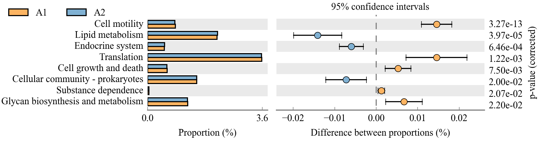 PICRUSt 2 將特征序列(16S rRNA)與微生物基因組數(shù)據庫(IMG,Integrated Microbial Genomes)參考序列對齊(aliign)構建進化樹,找到特征序列的“最近物種”,并根據已知物種的基因種類和豐度信息預測未知物種的基因信息,從而結合基因的KEGG通路信息預測整個群落的通路情況。通過組間差異分析,得到在組間具有顯著差異的功能,最后利用Stamp對結果進行差異可視化。