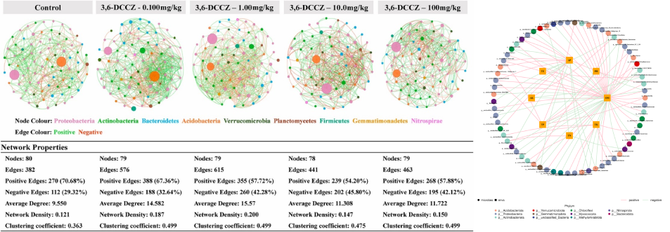 相關性網絡分析:網絡圖是相關性分析的一種表現(xiàn)形式,根據各個物種在各個樣品中的豐度以及變化情況,進行斯皮爾曼(Spearman )秩相關分析并篩選相應條件下的數(shù)據構建相關性網絡?;诰W絡圖的分析,可以獲得物種在環(huán)境樣本中的共存關系,得到物種在同一環(huán)境下的相互作用的情況及重要的模式信息,進一步解釋樣本間表型差異的形成機制。