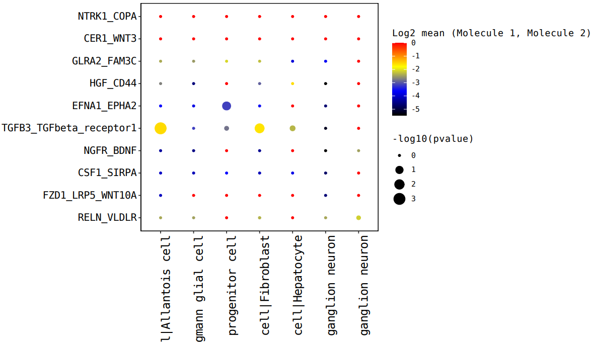 注:橫坐標是細胞類型互作,縱坐標是蛋白互作,點越大表示 p 值越小,顏色代表平均表達量
