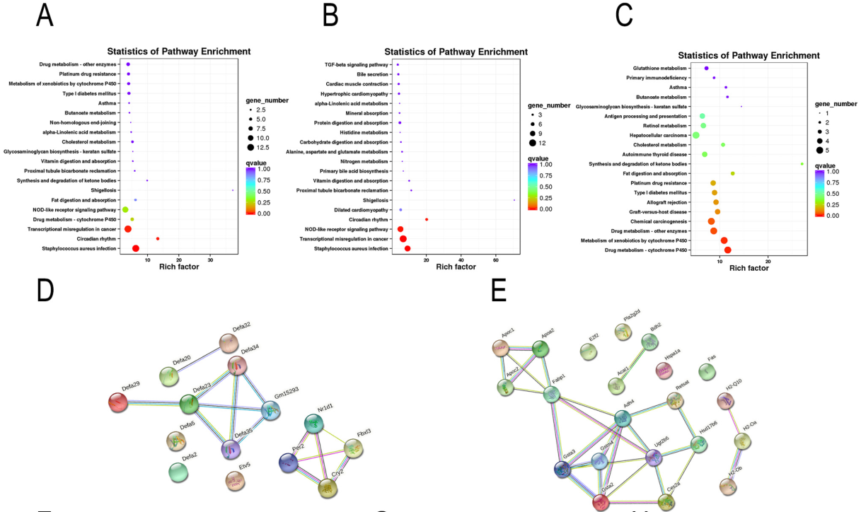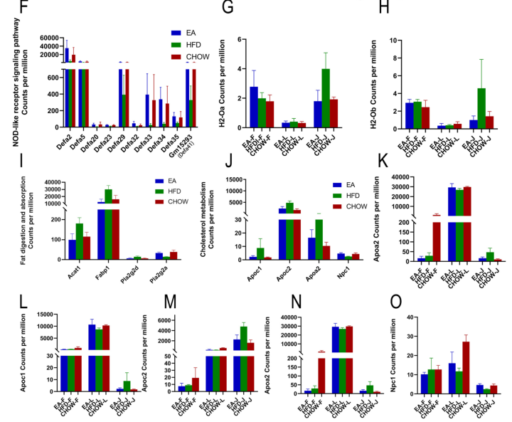 對共有DEG進(jìn)行功能富集分析,發(fā)現(xiàn)顯著富集的通路主要與宿主先天防御和脂質(zhì)代謝相關(guān)(圖3A);在去除功能未鑒定的基因或lncRNA后,獲得140個(gè)上調(diào)和92個(gè)下調(diào)的DEG也進(jìn)行功能富集分析(圖3B, 3C);然后,對top20通路的DEG進(jìn)行PPI調(diào)控網(wǎng)絡(luò)分析(圖3 D, 3E),結(jié)果顯示,EA主要上調(diào)的通路包括α防御素基因在內(nèi)的NOD樣受體信號通路(圖3 D),下調(diào)的通路脂質(zhì)代謝(包括脂質(zhì)消化和吸收途徑),以及免疫應(yīng)答相關(guān)通路(谷胱甘肽s-轉(zhuǎn)移酶和MHC II類相關(guān)基因)(圖3E)?;虮磉_(dá)直方圖顯示EA干預(yù)恢復(fù)大量異常表達(dá)的DEG,與腸粘膜免疫相關(guān)的DEG,如α防御素基因,可以通過EA顯著恢復(fù)(圖3F);與免疫反應(yīng)相關(guān)的H2-Ob和H2-OA僅在空腸區(qū)域下調(diào)(圖3G, 3H);EA干預(yù)恢復(fù)了fabp1、pla2g2d和acat1的表達(dá)水平,主要負(fù)責(zé)脂肪消化和吸收(圖3I);最后,EA干預(yù)通過下調(diào)apoc1、apoa2和apoc2以及上調(diào)npc1來調(diào)節(jié)膽固醇代謝(圖3J-O)。