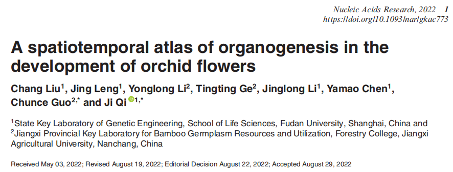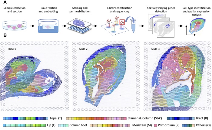 研究內容:利用10x Visium空間轉錄組學數(shù)據(jù)分析了蝴蝶蘭花器官早期發(fā)育過程中基因表達的動態(tài)變化。通過對時空表達分布的比較,確定了在特定組織/階段優(yōu)先表達的數(shù)千個基因,包括MADS-box基因和許多其他潛在下游基因,形成了花器官初始化、身份決定和形態(tài)建成的模型。對蘭花開花發(fā)育過程進行了系統(tǒng)的研究,為進一步研究蘭花開花過程中復雜而重要的基因調控網(wǎng)絡提供了寶貴的資源。