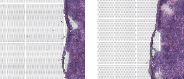 掃描顯微鏡產(chǎn)出的結果,是對片子各區(qū)域拍照后拼接而來的,部分型號的顯微鏡由于參數(shù)問題在拼接過程中可能會產(chǎn)生“拼接錯誤”。一般情況下,拼接錯誤的誤差在5~10μm左右。如果分析的分辨率較高時,存在“拼接錯誤”的圖像則會和實際位置產(chǎn)生錯位,進而影響到數(shù)據(jù)分析。
