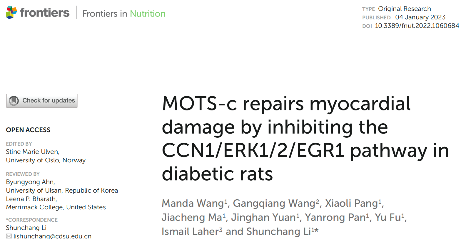 Manda Wang, Gangqiang Wang, Shunchang Li, et al. MOTS-c repairs myocardial damage by inhibiting the CCN1/ERK1/2/EGR1 pathway in diabetic rats. Front. Nutr., 04 January 2023Sec.