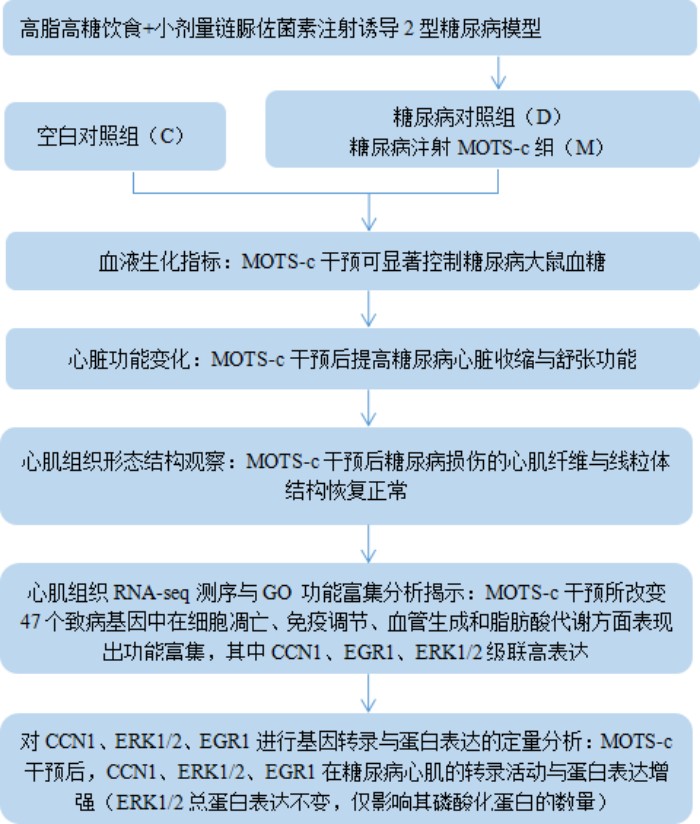 心臟重構(gòu)和功能障礙是糖尿病常見的并發(fā)癥,常導(dǎo)致嚴(yán)重的心血管事件。MOTS-c是一種線粒體衍生肽,通過加速葡萄糖攝取和提高胰島素敏感性來調(diào)節(jié)代謝穩(wěn)態(tài)。目前發(fā)現(xiàn),MOTS-c不僅可改善心臟與血管內(nèi)皮功能,且其含量在糖尿病患者血漿中明顯下降,使其成為糖尿病心血管并發(fā)癥的一個(gè)新的治療靶點(diǎn)。所以,該研究旨在探究MOTS-c對糖尿病心臟結(jié)構(gòu)與功能的影響并利用轉(zhuǎn)錄組學(xué)技術(shù)挖掘其中的分子機(jī)制。