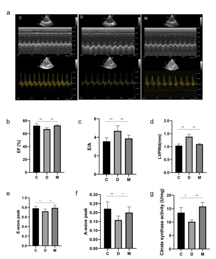 該研究利用透射電鏡測定了MOTS-c對糖尿病心肌超微結(jié)構(gòu)的影響。糖尿病引起心肌纖維排列紊亂和線粒體結(jié)構(gòu)的異常改變,包括心肌細(xì)胞排列不規(guī)則、嵴破裂、腫脹和空泡化(圖2)。MOTS-c治療糖尿病大鼠顯著降低心肌線粒體損傷,改善心肌纖維和線粒體結(jié)構(gòu)(圖2)。研究還通過測定檸檬酸合酶的活性,測定了線粒體功能。D組大鼠檸檬酸合酶的活性顯著降低,C組和M組的檸檬酸合酶的活性無統(tǒng)計(jì)學(xué)差異(圖3g)。