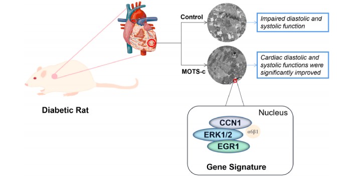 為期8周的MOTS-c治療減少了糖尿病患者的心功能障礙與線粒體損傷,MOTS-c可能是通過調(diào)節(jié)脂肪酸代謝、免疫調(diào)節(jié)、血管生成和細(xì)胞凋亡產(chǎn)生作用。CCN1/ERK1/2/EGR1的信號轉(zhuǎn)導(dǎo)可能在MOTS-c抑制心肌細(xì)胞凋亡中發(fā)揮重要作用。