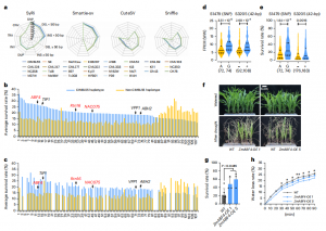 ZmNAC075的啟動(dòng)子區(qū)域發(fā)現(xiàn)了差異DNA甲基化。CIMBL55和B73的基因組序列比較發(fā)現(xiàn),在ZmNAC075B73的上游區(qū)域有兩個(gè)插入序列,具有較高的甲基化狀態(tài)。此外,攜帶ZmNAC075B73等位基因的種質(zhì)在干旱脅迫下的基因表達(dá)水平和幼苗存活率明顯低于攜帶ZmNAC075CIMBL55等位基因的種質(zhì)(圖4e,f)。CRISPR靶向基因敲除結(jié)合全基因組BS-seq分析顯示,發(fā)現(xiàn)兩個(gè)插入序列的CHH高甲基化狀態(tài)可能抑制基因表達(dá)進(jìn)而影響抗旱性(圖4l)。