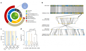 基因共線性反映了不同基因組間的基因含量及其在染色體上的排列。CIMBL55與B73基因組之間的共線基因分析表明,73%的CIMBL55基因位于共線基因塊,27%的基因是非共線基因。共線基因進(jìn)一步可以分為三類。1類基因(42%)位于B73和CIMBL55的同源染色體上,多數(shù)為單拷貝基因(one-one syntenic)。2類基因(29%)是位于各自基因組中兩條不同同源染色體上的重復(fù)基因(multi–multi synteny)(圖2b)。3類基因(2%)位于CIMBL55當(dāng)前組裝中未定位到染色體上的contigs中,但與B73中的相應(yīng)基因處于共線性塊中。非共線基因包括class 4(16%)和class 5(11%)2類基因。