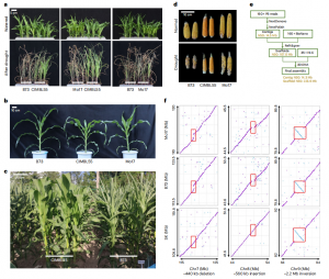此前研究中,基于全基因組關(guān)聯(lián)分析(GWAS)和孟德爾隨機(jī)化分析分別鑒定了42個(gè)和97個(gè)抗旱性候選基因。作者在CIMBL55基因組中對(duì)這些位點(diǎn)的基因型進(jìn)行研究,鑒定得到108個(gè)抗旱基因。值得注意的是,在CIMBL55中發(fā)現(xiàn)了65個(gè)基因的優(yōu)異單倍型,解釋了CIMBL55優(yōu)良抗旱性的遺傳基礎(chǔ)。此外,在108個(gè)基因中,有11個(gè)候選基因在非CIMBL55等位基因中被鑒定為優(yōu)勢(shì)單倍型,這表明其他種質(zhì)可能含有與CIMBL55互補(bǔ)的玉米抗旱性遺傳資源(圖3b)。