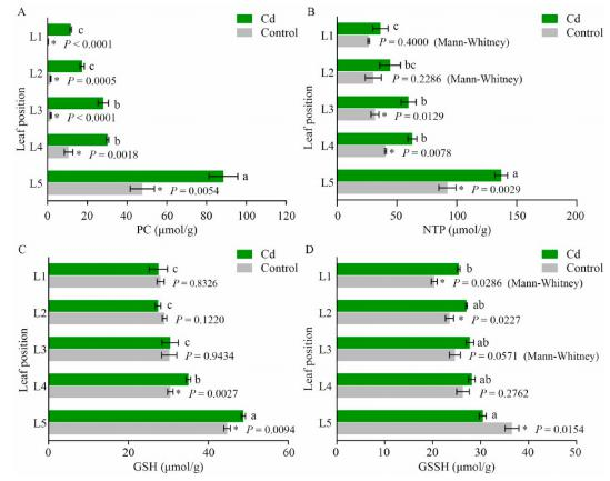 PC、GSH和NPT參與了超積累劑的Cd解毒機。Cd脅迫和對照組的植物螯合素(PCs)均隨葉片老化顯著增加。Cd處理顯著提高了各葉片PC含量,非蛋白硫醇(NPTs)含量也隨著葉片衰老而顯著增加,但隨葉片衰老的增加趨勢沒有變化。Cd處理顯著增加了衰老葉片(L4和L5)的谷胱甘肽(GSH)含量,但沒有提高幼苗和成熟苗的GSH含量。由此可以推斷,GSH、PC和NPT的增加及其與Cd的結(jié)合可能促進(jìn)了衰老葉片中Cd的積累。Cd處理顯著增加了幼葉和成熟葉的氧化谷胱甘肽(GSSH)含量(L1和L2),但降低了衰老葉(L5)的GSSH含量。由于氧化后的谷胱甘肽(GSSH)可被還原為還原型谷胱甘肽(GSH),還原性谷胱甘肽(GSH)可以通過GST進(jìn)一步催化GSH-Cd結(jié)合,GSSH向GSH的轉(zhuǎn)化與Cd在衰老葉片中的積累是一致的。