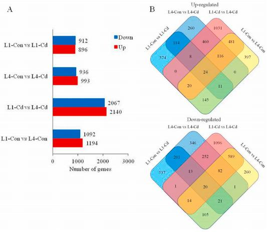 為了了解差異基因的功能,作者進(jìn)行了GO富集分析。四組的差異基因在節(jié)律過程、信號傳導(dǎo)和代謝過程等生物過程中都有20個豐富的分類。值得注意的是,與對照組相比,脫毒組的差異基因在幼葉和衰老葉中都有富集(L1-ConvsL1-Cd和L4-ConvsL4-Cd),但在幼葉和衰老葉的對照組和處理組中沒有明顯富集(L1-CdvsL4-Cd和L1-ConvsL4-Con)。