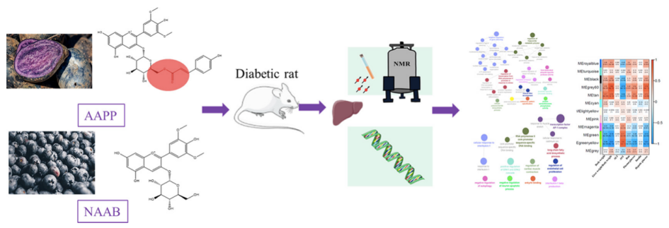 花色苷是植物中的一大類多酚化合物,目前已知是對氧化應(yīng)激、炎癥和能量穩(wěn)態(tài)有調(diào)節(jié)作用。已有報道發(fā)現(xiàn)花色苷具有抗糖尿病的療效?;ㄉ盏暮诵慕Y(jié)構(gòu)是花青苷,它可以糖基化形成非酰化的花青苷,糖苷可以?;笮纬甚;幕ㄇ嘬?。且最近有研究表明,與未?;幕ㄇ嘬障啾?,?;ㄇ嘬站哂懈玫姆€(wěn)定性和抗氧化活性。本研究利用全長轉(zhuǎn)錄組學(xué)和核磁共振代謝組學(xué)方法,比較了非?;王;ㄉ諏μ悄虿〈笫蟾闻K基因表達(dá)和代謝的影響。這是第一次綜合應(yīng)用這兩種強大的技術(shù)來研究肝臟基因表達(dá)和代謝產(chǎn)物的變化。