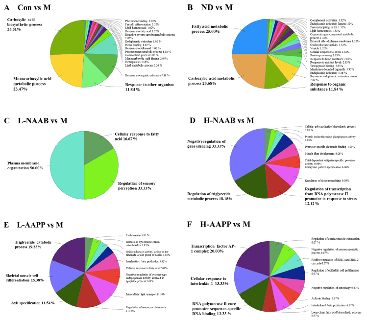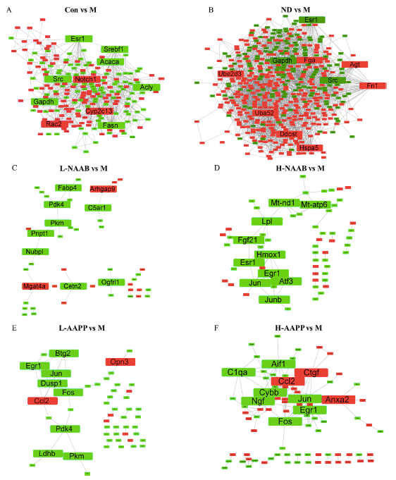 對不同分組中的DEGs進行ClueGO分析,以生成按功能分組的注釋網(wǎng)絡(luò)圖(圖4A?F)。在CON/M差異分組的結(jié)果中,DEGs主要富集在羧酸生物合成過程、單羧酸代謝過程和對其他有機物的反應(yīng)過程。在ND/M分組差異結(jié)果中,脂肪酸代謝過程、羧酸代謝過程和對有機物的反應(yīng)過程是富集排名前3的功能分組。在ND/M和CON/M分組中,DEGs主要在單羧酸代謝過程、羧酸生物合成過程、脂肪酸代謝過程、脂肪代謝過程和對有機物的反應(yīng)過程相關(guān)的通路中富集。在L-NAAB/M分組差異結(jié)果中,DEGs組要與三個功能通過有關(guān):質(zhì)膜組織、感覺調(diào)節(jié)和細(xì)胞對脂肪酸的反應(yīng)。在H-NAAB/M差異結(jié)果中,DEGs主要富集于基因沉默的負(fù)調(diào)控、甘油三酯代謝過程的調(diào)控以及RNA聚合酶II啟動子對脅迫反應(yīng)的轉(zhuǎn)錄調(diào)控。在L-AAPP/M比較中,DEGs在甘油三酯分解代謝過程、骨骼肌細(xì)胞分化和軸規(guī)范方面都明顯富集。在H-AAPP/M差異結(jié)果中,發(fā)現(xiàn)轉(zhuǎn)錄因子AP-1復(fù)合體、細(xì)胞對白細(xì)胞介素-1的反應(yīng)以及RNA聚合酶II核心啟動子序列特異性DNA結(jié)合等通路顯著富集。