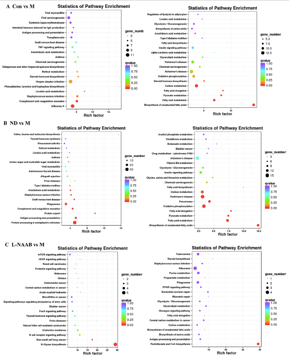 接下來,進行了KEGG通路富集分析。氣泡圖展示富集最顯著的前20條通路(圖5A?F)。與M組相比,Con組上調(diào)的DEGs主要富集于以下通路:苯丙氨酸、酪氨酸和色氨酸的生物合成,亞油酸代謝,金黃色葡萄球菌感染,補體和凝血級聯(lián)反應(yīng),以及甲型流感病毒。ND組與M組相比,上調(diào)的DEGs主要富集在花生四烯酸代謝、金黃色葡萄球菌感染、移植物抗宿主病、吞噬小體等通路中,而ND組與M組相比上調(diào)的DEGs主要富集在以下通路:苯丙氨酸、酪氨酸和色氨酸的生物合成、亞油酸代謝、金黃色葡萄球菌感染、移植物抗宿主病、吞噬小體。在CON/M和ND/M比較中,下調(diào)的DEGs在相似的KEGG通路中富集:不飽和脂肪酸的生物合成、脂肪酸代謝、丙酮酸代謝、脂肪酸伸長、氧化磷酸化和碳代謝。對于花色苷處理組,L-NAAB組上調(diào)的DEGs在N-糖鏈生物合成通路中顯著富集。L-NAAB組下調(diào)的DEGs在泛酸和CoA生物合成通路中顯著富集。在H-NAAB、L-AAPP和H-AAPP組中沒有發(fā)現(xiàn)下調(diào)的DEGs有顯著富集的通路,在H-NAAB和L-AAPP組中上調(diào)的DEGs也沒有富集的通路。H-AAPP中上調(diào)的DEGs在補體和凝血級聯(lián)、不飽和脂肪酸和變形蟲病的生物合成等通路中顯著富集。