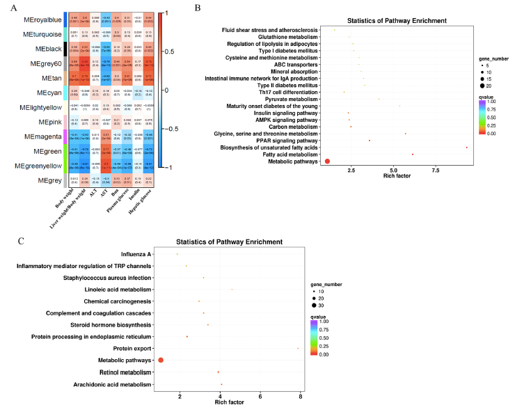 使用DEGs進行WGCNA分析以確定共表達(dá)模塊及其與臨床特征的相關(guān)性。確定了12個共表達(dá)模塊,并與以前報道的各種臨床特征(體重、AST、ALT、血尿素氮、血糖和胰島素)相關(guān)(圖7A)。MEgery 60和MEtan模塊與體重、肝重/體重比、血糖、肝糖呈正相關(guān),與天冬氨酸轉(zhuǎn)氨酶呈負(fù)相關(guān)。MEgreen和MEgreenyellow模塊與體重、肝重/體重比、血糖、肝糖呈負(fù)相關(guān),與AST值呈正相關(guān)。接下來,對MEgrey60和MEtan模塊以及MEgreen和MEgreenyellow模塊中的基因進行了KEGG通路富集分析。結(jié)果發(fā)現(xiàn)MEgrey60和MEtan中的基因富集的通路主要涉及脂類代謝(脂肪酸代謝、不飽和脂肪酸的生物合成、脂肪細(xì)胞脂解的調(diào)節(jié))、氨基酸代謝(甘氨酸、絲氨酸和蘇氨酸代謝、半胱氨酸和蛋氨酸代謝、谷胱甘肽代謝)、糖尿病(青少年成熟期糖尿病、II型糖尿病、I型糖尿病、胰島素信號通路)(圖7B)。MEgreen和MEgreenyellow模塊中的基因主要富集在花生四烯酸代謝、視黃醇代謝、代謝途徑、蛋白質(zhì)輸出、內(nèi)質(zhì)網(wǎng)蛋白質(zhì)加工、類固醇激素生物合成、補體和凝血級聯(lián)、亞油酸代謝以及TRP通道的炎癥介質(zhì)調(diào)節(jié)(圖7C)。