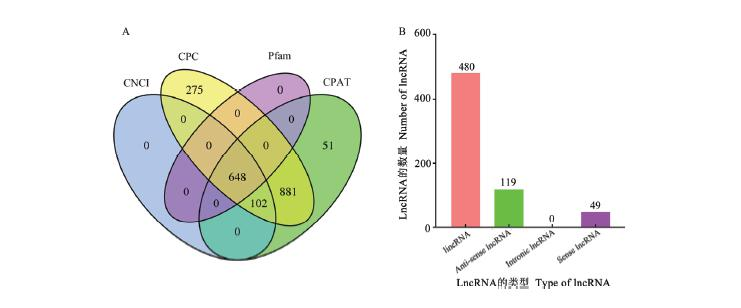 利用CPC、CPAT、CNCI和Pfam4種方法依次鑒定出1906、1682、750和648條lncRNA,四者的交集為648個(圖3-A);其中基因間區(qū)lncRNA(longintergenicRNA,lincRNA)、反義鏈lncRNA(anti-senselncRNA)和正義鏈lncRNA(senselncRNA)的數(shù)量分別為480、119和49個(圖3-B)。