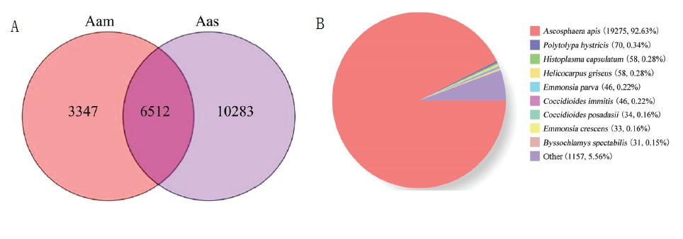 圖2球囊菌菌絲和孢子全長轉(zhuǎn)錄本的Venn分析(A)、全長轉(zhuǎn)錄本的Nr數(shù)據(jù)庫注釋(B)Fig.2Vennanalysisoffull-lengthtranscriptsinA.apismyceliumandspore(A)、Nrdatabaseannotationoffull-lengthtranscripts(B)