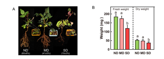 樣品做了三組處理:干旱處理0天(ND stress)、5天(MD stress)和10天(SD stress),并對(duì)光合作用進(jìn)行了檢測(cè),同時(shí)檢測(cè)了脫落酸(ABA)和生長(zhǎng)素(auxin)的含量。