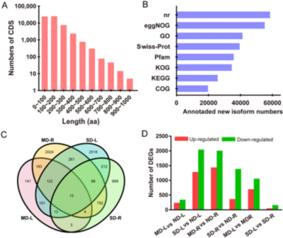 為了闡明干旱響應(yīng)的分子機(jī)制,對(duì)不同處理植株的葉(L)和根(R)進(jìn)行了轉(zhuǎn)錄組測(cè)序。6個(gè)樣本(每個(gè)樣本3個(gè)生物重復(fù))共18個(gè)cDNA文庫(kù),包括ND-L、MD-L、SD-L、ND-R、MD-R和SD-R。從最初的116,192,367 raw reads中,提取了115,374,531 (99.29%) clean reads,組成玫瑰全長(zhǎng)非嵌合轉(zhuǎn)錄組。通過(guò)與Rosa chinensis 基因組比對(duì),在轉(zhuǎn)錄組中鑒定出了48,549個(gè)基因,占基因組長(zhǎng)度的21.46%。此外,共鑒定出59,404個(gè)開(kāi)放閱讀框(ORF),如圖2A所示,只有19個(gè)編碼序列(CDSs)編碼>800個(gè)氨基酸的多肽,而58%的CDSs編碼長(zhǎng)度在100 – 400個(gè)氨基酸的小肽(圖2A)。最后,89,044個(gè)非冗余轉(zhuǎn)錄本中的58,753個(gè)可以被注釋到不同的數(shù)據(jù)庫(kù)中(圖2B)。