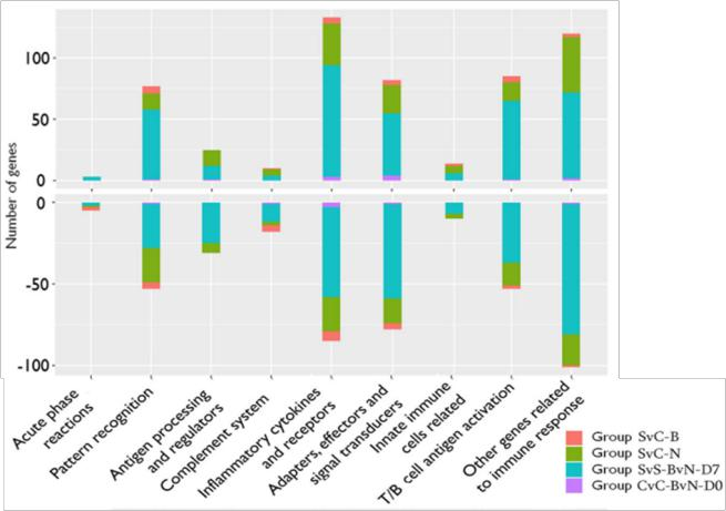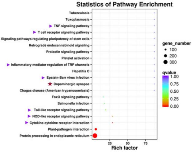 在CyHV-3感染后第0天和第7天提取鯉魚(yú)頭腎組織,并通過(guò)Illumina和PacBio測(cè)序分析轉(zhuǎn)錄組。在對(duì)涉及的GOterm和KEGG途徑進(jìn)行分析。加權(quán)基因共表達(dá)網(wǎng)絡(luò)分析用于揭示lncRNA對(duì)免疫基因的調(diào)節(jié)。結(jié)果表明,繁殖鯉魚(yú)品系通過(guò)一種特定的先天免疫機(jī)制對(duì)CyHV-3感染產(chǎn)生了顯著的抗性,主要的生物學(xué)過(guò)程是自噬、吞噬、細(xì)胞毒性和凝集素和MUC3阻斷病毒。此外,還有免疫抑制信號(hào)途徑,如IL21R對(duì)STAT3的抑制,PI3K介導(dǎo)的感染時(shí)多巴胺對(duì)炎癥的抑制,以及NLRC3在穩(wěn)定狀態(tài)下對(duì)STING的抑制。從非抗性品系中還發(fā)現(xiàn)了CyHV-3的可能易感因素,如ITGB1、TLR18和CCL4。本研究結(jié)果還表明,LncRNA調(diào)節(jié)的Nramp和PAI分別促進(jìn)病毒感染和感染細(xì)胞的增殖,而T細(xì)胞白血病同源框3(TLX3),以及l(fā)ncRNA的半乳糖凝集素3可能在抗病制中發(fā)揮作用。因此,免疫遺傳不敏感或易受CyHV-3感染的免疫因子已被揭示。