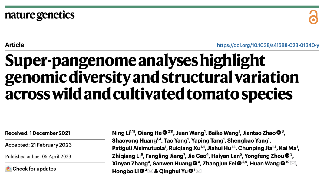 2023年4月6日,Nature Genetics《自然·遺傳學(xué)》發(fā)表了由新疆農(nóng)業(yè)科學(xué)院園藝作物研究所牽頭,中國農(nóng)業(yè)科學(xué)院深圳農(nóng)業(yè)基因組研究所、作物科學(xué)研究所、生物技術(shù)研究所等團(tuán)隊(duì)合作完成的題為Super-pangenome analyses highlight genomic diversity and structural variation across wild and cultivated tomato species的研究論文。該研究繪制了11個(gè)野生和栽培番茄的染色體級別高質(zhì)量基因組圖譜,闡明了茄屬番茄組(Solanum?section?Lycopersion)的基因組演化歷史,構(gòu)建了番茄超級泛基因組/圖基因組,并進(jìn)一步在野生番茄中克隆到可大幅提升栽培番茄產(chǎn)量的新基因一個(gè)。該研究既是對番茄基因組資源的重要補(bǔ)充,同時(shí)也對其它作物基因組學(xué)研究和野生種質(zhì)資源尤其是近緣野生種的利用具有重要啟發(fā)意義。該成果也是新疆農(nóng)業(yè)科學(xué)院首次以第一單位在Nature Genetics上發(fā)表長篇研究論文。?百邁客為本研究提供了相關(guān)測序及分析服務(wù)。