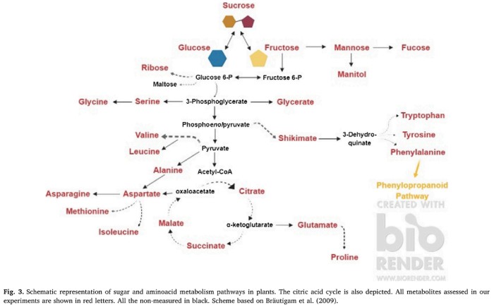 采集“Katerini 53”,“Xanthi 81”和“Smirrni 3B”葉片樣品,并使用氣相色譜GC-MS 和 LC-MS / MS 方法進行代謝分析。基因型預(yù)先鑒定為不同的色譜模式,共有 78 種代謝化合物(包括糖,氨基酸,有機酸)差異積累,如圖 3 所示。詳細的非靶向 GC-MS 代謝組學(xué)分析用于鑒定煙葉中產(chǎn)生的大多數(shù)主要代謝產(chǎn)物。在本研究中,所測得的最豐富的可溶性糖是果糖,葡萄糖,半乳糖和蔗糖。在果糖和蔗糖中檢測到統(tǒng)計學(xué)差異;“Katerini 53”中的果糖含量更高,而“Smierni 3B”中的蔗糖含量更高?!癒aterini 53”與其它兩個品種相比葡萄糖和半乳糖水平較高,差異無統(tǒng)計學(xué)意義。在可溶性醇中,兩個豐富的代謝產(chǎn)物是山梨糖醇和肌醇,但在品種之間未檢測到統(tǒng)計學(xué)上的顯著差異。這三個品種中的蘋果酸含量沒有任何統(tǒng)計上顯著不同。“Xanthi 81”葉子的氨基酸含量最高,但谷氨酸和 γ-氨基丁酸(GABA)除外。GABA 和脯氨酸是煙葉中的主要氨基酸。與其他兩個品種相比,“Smirrni 3B”中的 GABA 水平明顯更高。’Smirrni 3B’和’Xanthi 81’中的脯氨酸水平較高,而“Katerini 53”的脯氨酸水平最低。在“Smirrni 3B”中檢測到了高濃度的甘氨酸和絲氨酸這兩種必需氨基酸。煙草生物堿在根部合成,然后轉(zhuǎn)運到葉片。生物堿、尼古丁與植物抗草食動物防御有關(guān)。在三個品種中檢測到的尼古丁濃度在統(tǒng)計學(xué)上有顯著差異。結(jié)果表明,“Xanthi 81”的尼古丁濃度最高,而“Smirrni 3B”的尼古丁濃度最低。與“Katerini 53”相比,“Xanthi 81”中腐胺的含量有所降低,但其濃度仍高于“Smirrni 3B”。鑒定了所有擬參與煙草中尼古丁生物合成的相應(yīng)基因,但僅發(fā)現(xiàn)少數(shù)幾個在成熟葉片中表達。然而,基因 XS 和 QPT(三分之二)在“Xanthi 81”中表達較高。與其它兩個品種相比,這與“Xanthi 81”葉片中較高的尼古丁含量相關(guān),這表明它可能是遺傳控制的。