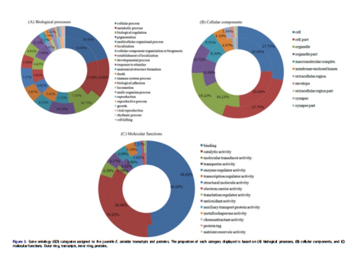 3294個(gè)蛋白及11619轉(zhuǎn)錄本被功能注釋到(圖4)。這些轉(zhuǎn)錄本和蛋白質(zhì)分別分布在25和24個(gè)COG類別中,其中“僅一般功能預(yù)測”是轉(zhuǎn)錄本的較大組(總共1732個(gè))和蛋白質(zhì)(630),之后是“信號轉(zhuǎn)導(dǎo)機(jī)制”,“翻譯后修飾、蛋白質(zhì)翻轉(zhuǎn)、伴侶”、“功能未知”、“轉(zhuǎn)錄”、“細(xì)胞內(nèi)轉(zhuǎn)運(yùn)、分泌和囊泡轉(zhuǎn)運(yùn)”、“細(xì)胞骨架”和“RNA加工和修飾”。在“脂質(zhì)轉(zhuǎn)運(yùn)和代謝”這類中轉(zhuǎn)錄本3.2%(總共372個(gè))和蛋白質(zhì)4.6%(153)