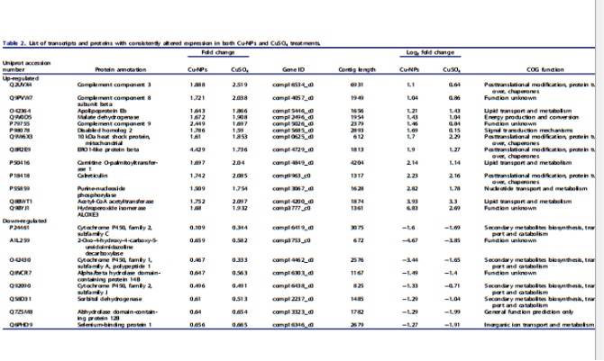 用蛋白質(zhì)組學(xué)分析方法獲得的差異表達(dá)蛋白與mRNA進(jìn)行了比較分析;根據(jù)他們的氨基酸序列來匹配轉(zhuǎn)錄本,在Cu-NPs組與對照組及CuSO4和對照組相比較,分別共140(100%)和352(99.4%)個(gè)差異表達(dá)的蛋白。我們進(jìn)一步確定在兩種銅粒子下蛋白和基因的表達(dá)是否一致,發(fā)現(xiàn)21的轉(zhuǎn)錄和蛋白在同一方向改變(13個(gè)上調(diào),八個(gè)下調(diào))(表2)。有趣的是,大多數(shù)基因(16個(gè)基因)的表達(dá)在Cu-NPS比CuSO4更強(qiáng)烈,但是蛋白質(zhì)卻相反。