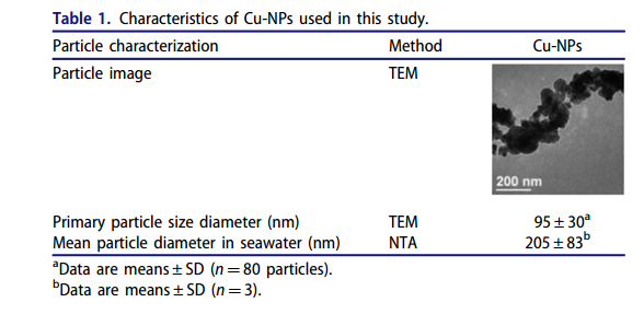 Cu-NPS呈顆粒狀,呈團(tuán)聚狀,海水中的平均粒徑(205±83 nm)大于實(shí)驗(yàn)主要的粒徑(95±30 nm)。(見下表)