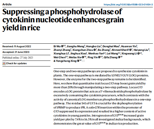 作者通過秈稻品種特青和粳稻品種02428構(gòu)建高級(jí)遺傳群體克隆了產(chǎn)量相關(guān)基因GY3,其啟動(dòng)子區(qū)域的反轉(zhuǎn)座子插入增強(qiáng)了啟動(dòng)子區(qū)域的表觀修飾,降低GY3表達(dá)量,從而減少細(xì)胞分裂素合成前體底物的無效消耗,提高體內(nèi)活性的細(xì)胞分裂素含量,增加每穗粒數(shù)和谷物產(chǎn)量。GY3可作為后期秈稻高產(chǎn)育種的重要目標(biāo)基因,推動(dòng)產(chǎn)量提升。