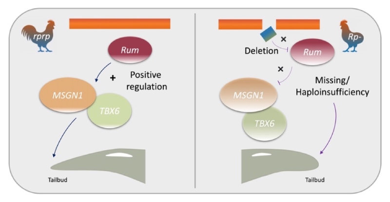 通過對包含家系內(nèi)特殊基因型個(gè)體的突變位點(diǎn)進(jìn)行綜合篩選和分析后,一個(gè)4.2 kb的缺失被確定與瓢雞的無尾表型完全相關(guān)。在對致因區(qū)間內(nèi)的基因表達(dá)結(jié)果進(jìn)行深入探究后,一個(gè)全新的基因Rum(長度大于22 kb,無內(nèi)含子),其表達(dá)呈現(xiàn)出無尾表達(dá)缺失,雜合子是顯性純合子表達(dá)量的一半的現(xiàn)象。深入研究發(fā)現(xiàn)Rum的表達(dá)具有胚胎特異性,研究人員認(rèn)為Rum的表達(dá)缺失以及雜合子中的單倍劑量不足,使其無法正常調(diào)控MSGN1基因長轉(zhuǎn)錄本以及TBX6等基因的正常表達(dá),進(jìn)而使得尾部骨骼發(fā)育出現(xiàn)異常。