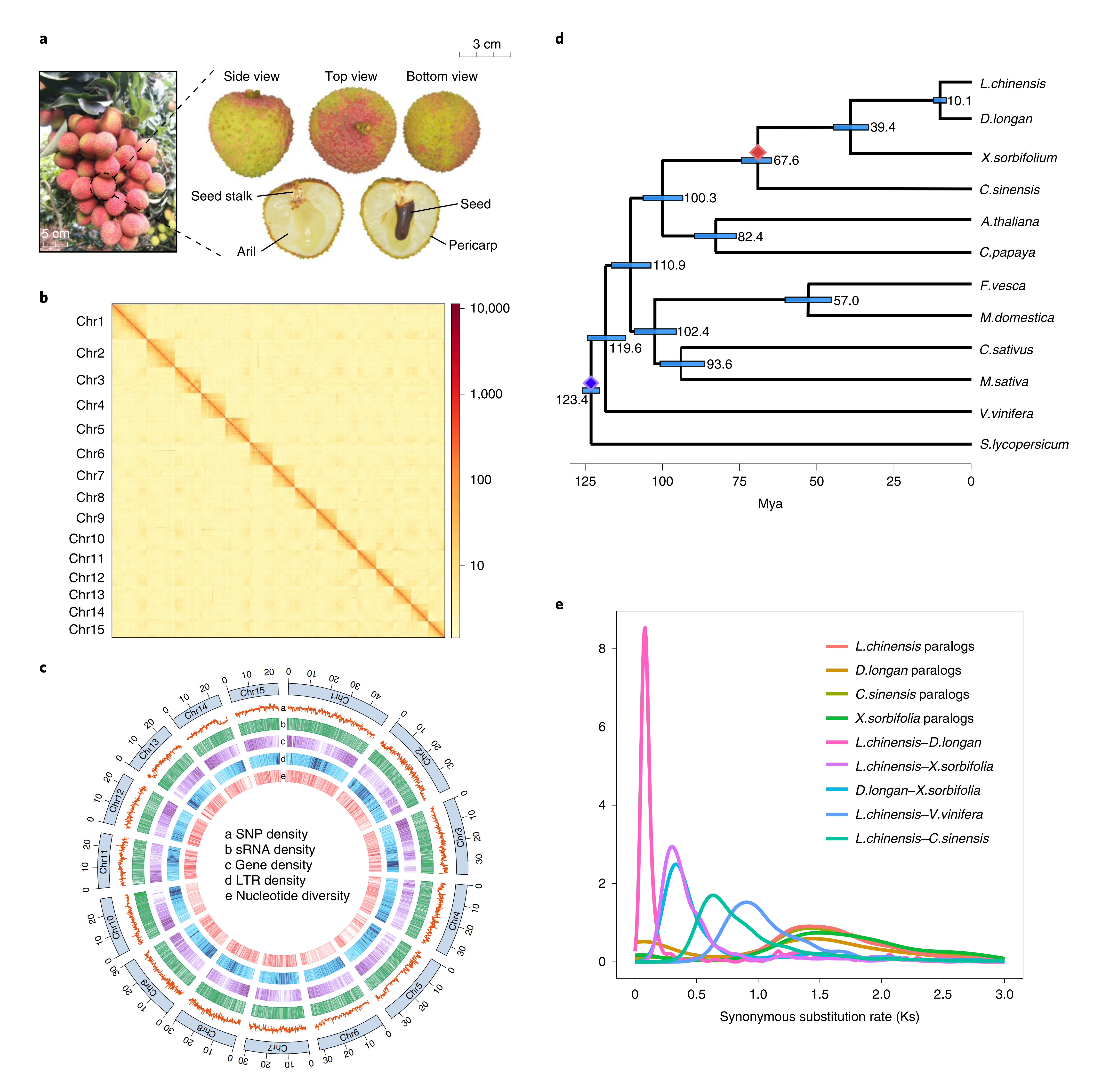 比較基因組分析表明,荔枝和龍眼-10百萬年前(mya)從祖先物種中分離開來,而荔枝所在的無患子科與蕓香科大約在67.6mya分離開。荔枝、龍眼、文冠果和甜橙自共享y三倍化事件后并無獨(dú)立的WGD事件。