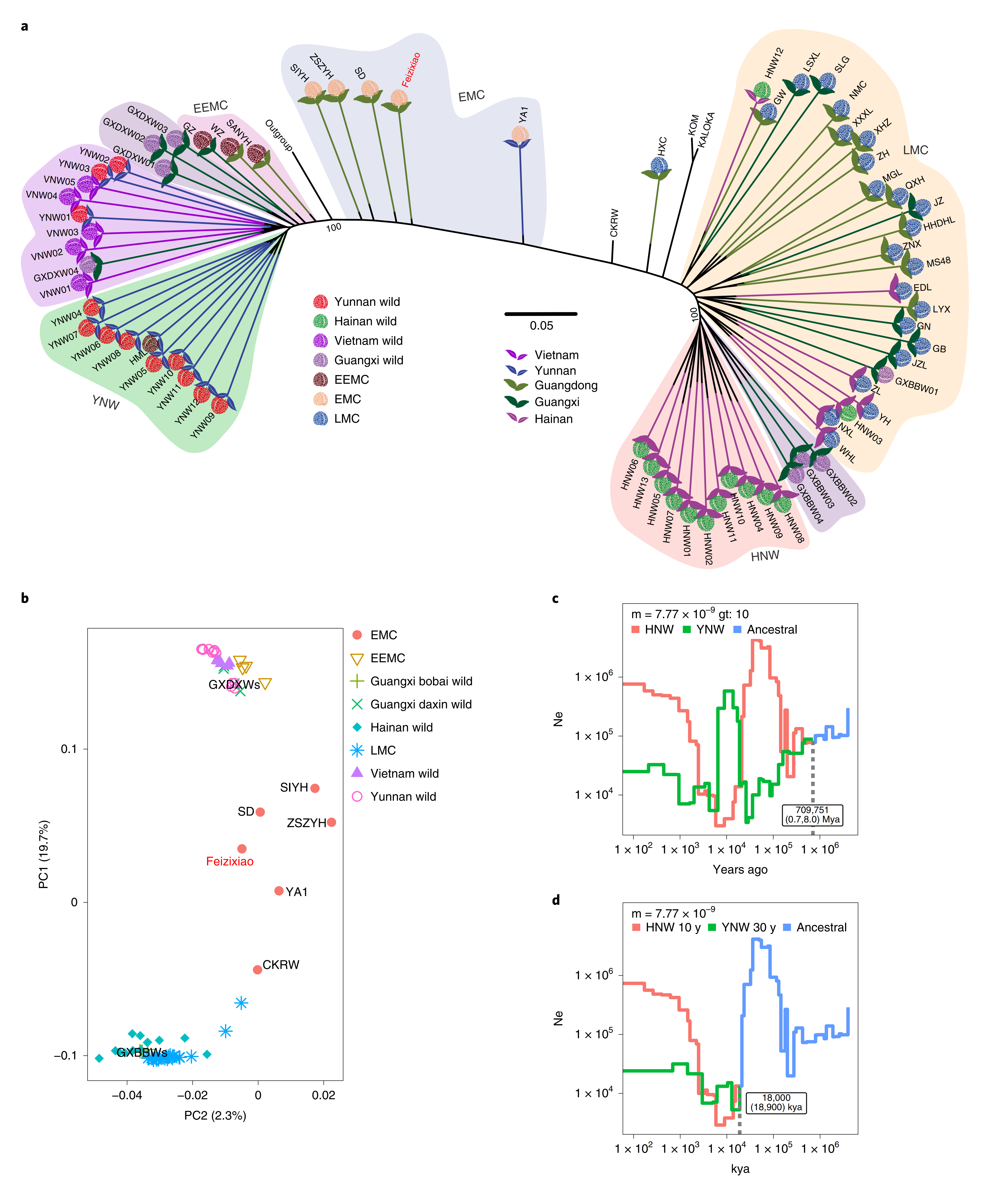 利用通過對72份荔枝進(jìn)行重測序分析,發(fā)現(xiàn)荔枝大致可分為3個群體,即云南極早熟品種(EEMC/YNW)、海南晚熟品種(LMCHNW)、早熟栽培種(EMC)。其中值得注意的是,大新野生和博白野生荔枝雖然都位于廣西,但兩者間卻存在明顯的遺傳差異。分析發(fā)現(xiàn)云南野生種群經(jīng)歷了強(qiáng)烈的馴化瓶頸。
