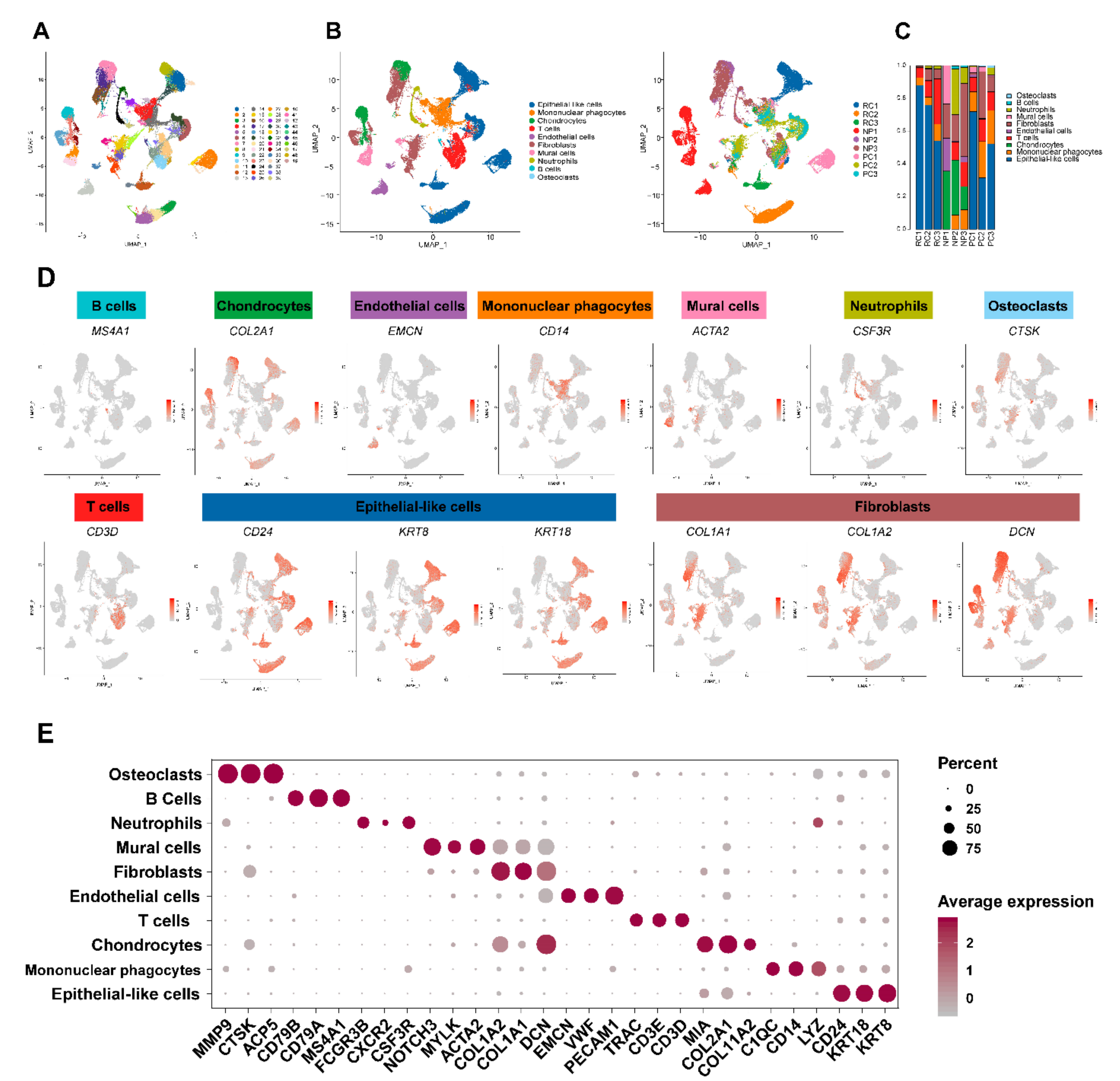該研究通過生成 6 名脊索瘤患者(包括 3 名原發(fā)性腫瘤和 3 名復(fù)發(fā)性腫瘤)和 3 名匹配的 LDH 患者組織的單細胞基因表達譜,總共獲得72097個細胞,其中46987個細胞來自脊索瘤,25110個來自NP組織樣本。如圖1A-B所示,a總共鑒定了49個細胞簇,這些簇的注釋導(dǎo)致了10種細胞類型的分離。被鑒定為上皮樣細胞、成纖維細胞、T 細胞和 B 細胞的細胞屬于多個簇,表明這些細胞類型是異質(zhì)的(圖 1B)。與NP組織相比,脊索瘤組織中存在較多上皮樣細胞,尤其是復(fù)發(fā)腫瘤中。此外,原發(fā)性和復(fù)發(fā)性脊索瘤均顯示軟骨細胞、成纖維細胞和內(nèi)皮細胞比例下降(圖 1C)。10 個細胞亞群的代表性基因的表達如圖 1D-E 所示。這些結(jié)果共同表明上皮樣細胞代表腫瘤細胞。