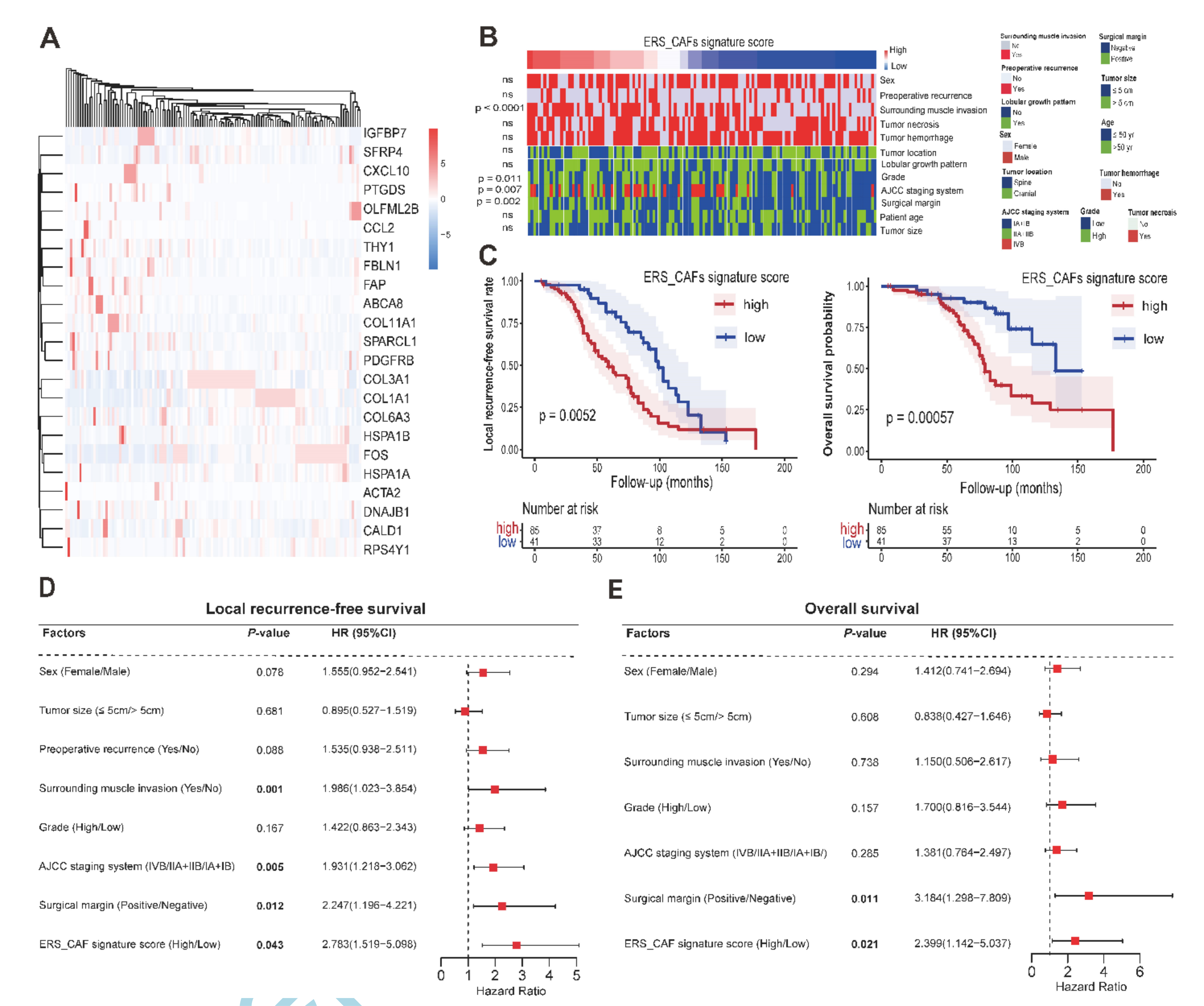 為了驗證 ERS-CAF 的促腫瘤作用,該研究對來自脊索瘤患者的 126 個樣本進行了總 RNA 測序(圖 4A)。使用代表該 CAF 子集的基因集計算每位患者的 ERS-CAF 特征評分,其中包括 ERS 相關(guān)基因(例如 HSPA1A、HSPA1B、CCL2 和 DNAJB1)和 CAF 特定標記(例如 THY1、FAP、?和 COL1A1)。ERS-CAF 特征評分與臨床數(shù)據(jù)之間的關(guān)系如圖 4B 所示。如上所示,ERS-CAF特征評分與腫瘤侵犯周圍肌肉(P?<?0.0001)、腫瘤分級(P?=?0.011)、AJCC分期(P?=?0.011)顯著相關(guān)。P?=?0.007)和手術(shù)切緣(P?=?0.002)。與原發(fā)腫瘤患者相比,復(fù)發(fā)腫瘤患者的 ERS-CAF 特征較高(-0.06?±?0.53 vs. -0.10?±?0.51),但這種差異并不具有統(tǒng)計學意義(t?=?-0.404)?,p?=?0.687)。對于生存分析,作者使用在線平臺確定ERS-CAF特征評分的閾值,并根據(jù)截止點將患者分為高(>截止)和低(≤截止)亞組。Kaplan-Meier 分析表明,ERS-CAF 特征評分的增加可預(yù)測不利的 LRFS 和 OS(圖 4C),在控制 Cox 多元回歸模型中的重要臨床因素后,這一結(jié)果仍然顯著(圖4D–E)。這些數(shù)據(jù)表明使用 GSVA 特征來反映脊索瘤組織中的 ERS-CAF 亞群的可靠性,并強調(diào)了 ERS-CAF 在調(diào)節(jié)腫瘤進展中的重要性。