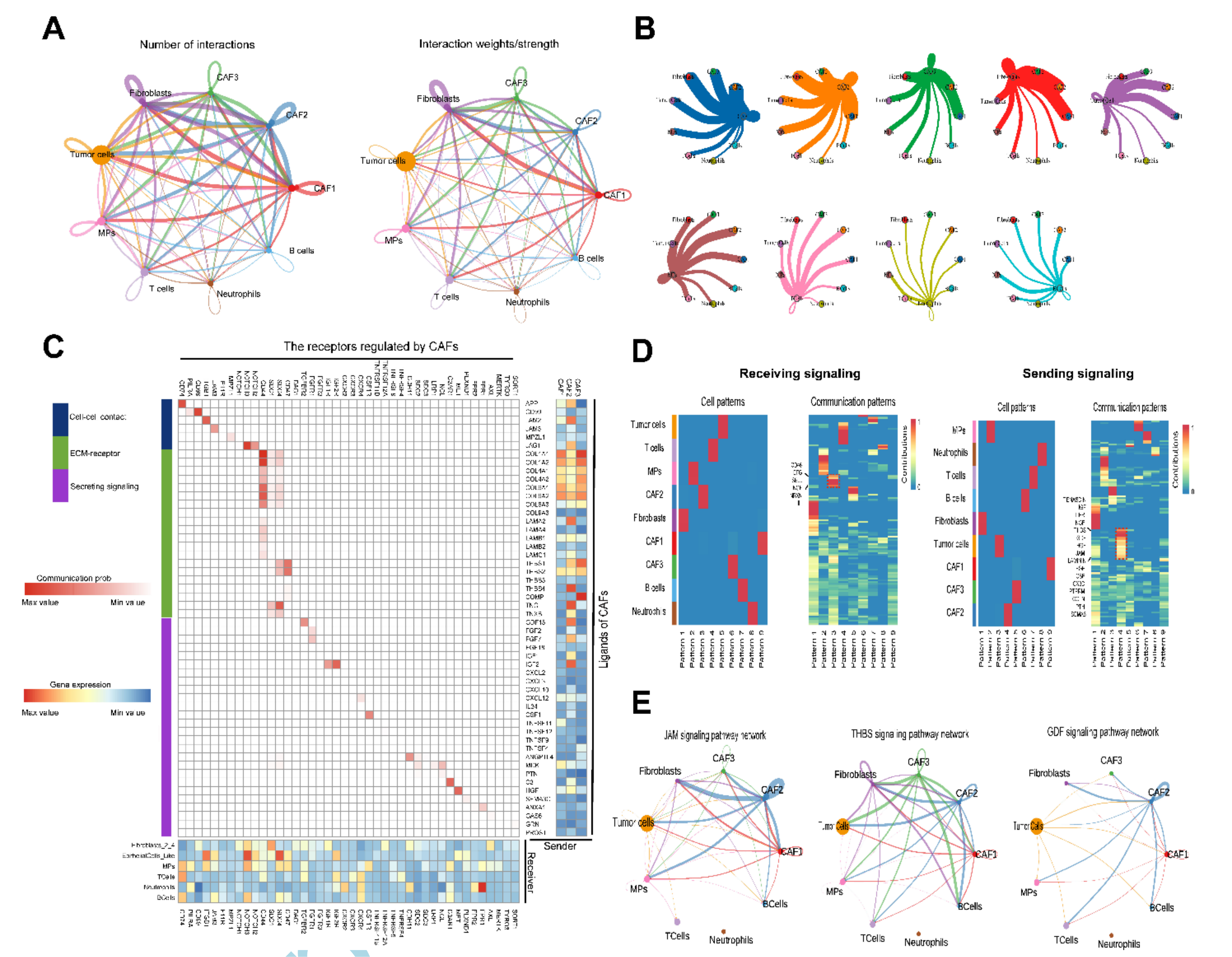 為了推斷ERS-CAF亞群促進腫瘤進展的可能機制,該研究使用CellChatDB數(shù)據(jù)庫來剖析CAF亞群與其他細胞類型之間的細胞間通訊。結(jié)果表明,CAF 亞群(尤其是 ERS-CAF 和 CAF 簇 1)顯著激活并與多種細胞相互作用(圖 5A 和 B)。鑒定出許多配體-受體對,以證明 ERS-CAF 與脊索瘤中主要細胞類型之間廣泛的分子相互作用。對于傳入信號,ERS-CAF 主要接受來自 CD46、EFG、SELL、NGF、NRXN 和 HH 分子的信號(圖 5D)。在發(fā)送信令方面,ERS-CAF 主要產(chǎn)生 TENASCIN、IGF、LIFR、NGF、THBS、GDF 和 JAM 信號(圖 5D)。此外,ERS-CAF 被證明是多個細胞通訊網(wǎng)絡(luò)中的核心細胞,包括 JAM、THBS 和 GDF 信號通路(圖 5E),所有這些都已被證明在細胞通訊網(wǎng)絡(luò)中發(fā)揮著重要作用。此外,該研究對 10 個腫瘤組織樣本進行了 QIF 檢測,以進一步證實 ERS-CAF 與腫瘤細胞之間 JAM2 和 JAM3 的相互作用信號傳導(dǎo)。研究發(fā)現(xiàn),JAM2/JAM3 信號在腫瘤細胞靠近 ERS-CAF 的區(qū)域表達更多。綜上所述,這些數(shù)據(jù)表明 ERS-CAF 可以通過各種分子機制促進脊索瘤進展。