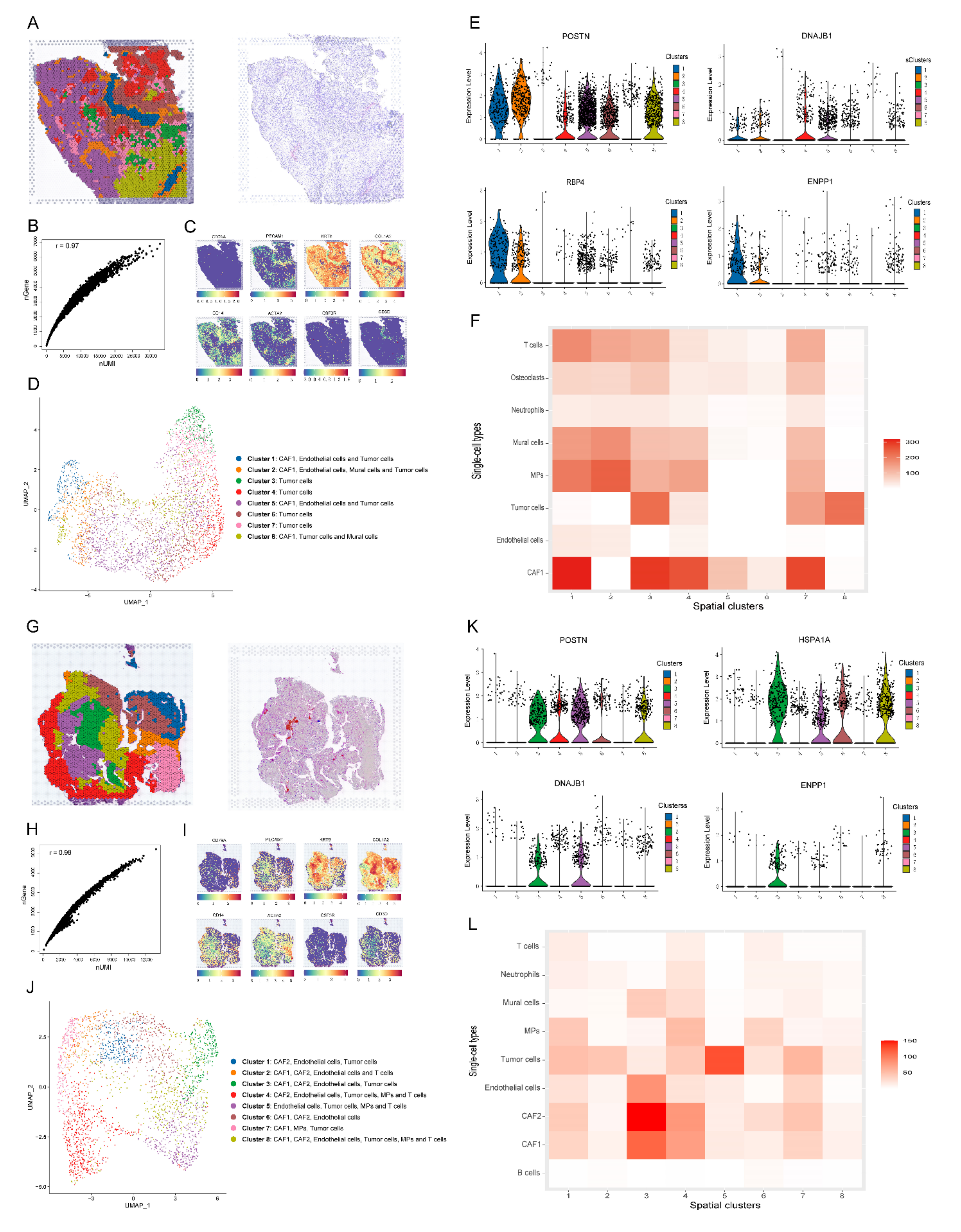 為了進一步剖析脊索瘤組織中 ERS-CAF 的空間特征,該研究對 3 個新鮮腫瘤樣本(包括 2 個原發(fā)腫瘤和 2 個復(fù)發(fā)腫瘤)進行了空間轉(zhuǎn)錄組測序;圖 6A 和 G )。在 ST 數(shù)據(jù)中觀察到 UMI 和標記基因之間存在很強的相關(guān)性(圖 6B 和 H),表明質(zhì)量令人滿意。上皮樣細胞(KRT8)、單核吞噬細胞(CD14)、T細胞(CD3D)、內(nèi)皮細胞()的標記基因PECAM1)、中性粒細胞(CSF3R)、B 細胞(CD79A)、成纖維細胞(COL2A1)和壁細胞(ACTA2)在 ST 數(shù)據(jù)中檢測到(圖 6C 和 I)。隨后,通過 UMAP 方法降維,在原發(fā)性和復(fù)發(fā)性腫瘤樣本中識別出 8 個主要細胞簇(圖 6D 和 J)。作者在原發(fā)性腫瘤中觀察到 CAF 簇 1,而在復(fù)發(fā)腫瘤標本中觀察到 CAF 簇 1 和 ERS-CAF(圖 6D 和 J)。這些發(fā)現(xiàn)通過 CAF 標記基因表達分析(圖 6E 和 K)以及 MIA 結(jié)果(圖 6F 和 L)得到證實。