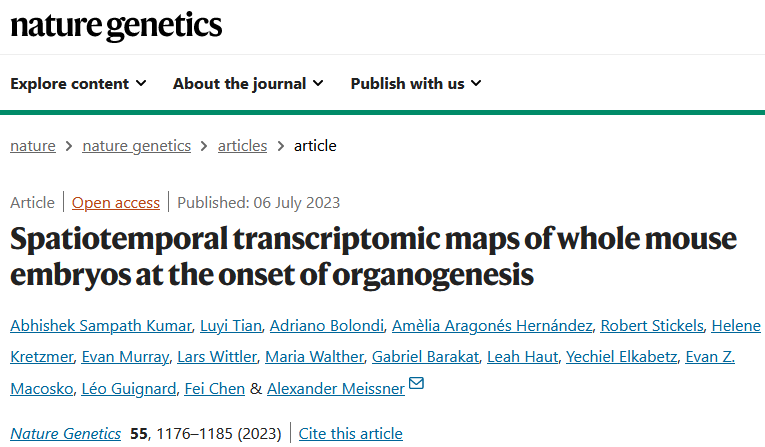 英文標題:Spatiotemporal transcriptomic maps of whole mouse embryos at the onset of organogenesis