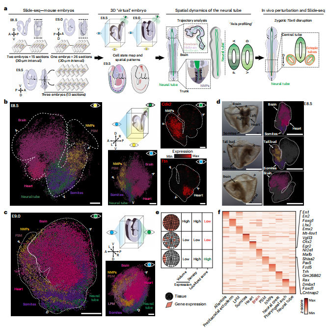 取樣策略:小鼠E8.5期胚胎:2個胚胎,15張10 μm切片,間隔30 μm;小鼠E9.0期胚胎:1個胚胎,26張10 μm切片,間隔20 μm;小鼠E9.5期胚胎:3個胚胎,13張10 μm切片在本研究中,研究人員使用Slide-seq技術構建了完整胚胎E8.5和E9.0以及部分E9.5胚胎的空間轉錄組圖譜。為了支持該項研究的應用,研究人員開發(fā)了sc3D——一個重建和探索三維“虛擬胚胎”的工具,它可以定量研究區(qū)域化的基因表達模式。發(fā)育中的神經(jīng)管主胚軸的測量揭示了幾個以前未注釋的基因具有不同的空間模式。文章還描述了Tbx6突變胚胎中出現(xiàn)的“異位”神經(jīng)管的相互沖突的轉錄特性。綜上所述,文章提出了一個用于整個胚胎結構和突變表型時空研究的實驗和計算框架。